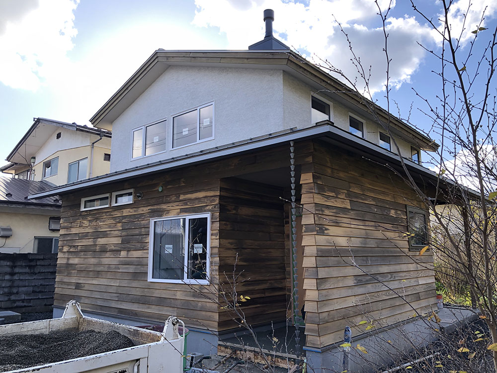 シラスそとんの塗り壁と杉板の下見板張りによる外観。 コシヤマ製の木製サッシや玄関ドアなど、開口部の木質化にもこだわった新築住宅です。 リビングには長い冬時間を楽しむネスターマーティンの薪ストーブも。 こだわりの無垢材による住まいの心地よさをぜひご体感ください。